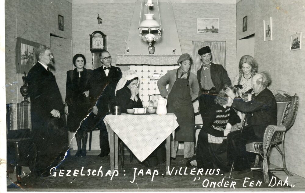 Foto, zwart/wit; scene met 9 personen in een huiskamer; Op de foto in wit de tekst: Gezelschap:Jaap Villerius, " Onder Een Dak"
