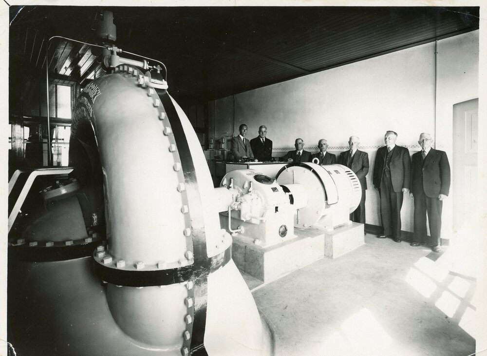 Foto, zwart/wit; Plaatsing elektrogemaal in het gemaal van de polder Vierpolders te Zwartewaal. v.l.n.r. Geerling v.d. Boogaard (machinist), A.J. van der Blom ( elektrotechnicus i.s.m. Strok),?, Hadde Boender, rest onbekend