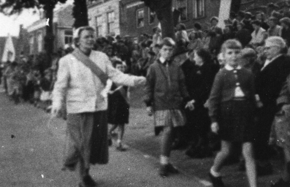 Foto, zwart/wit, Schoolkinderen o.l.v. mevr Broers op weg naar de aankomst van Koningin Juliana op de kade verderop.