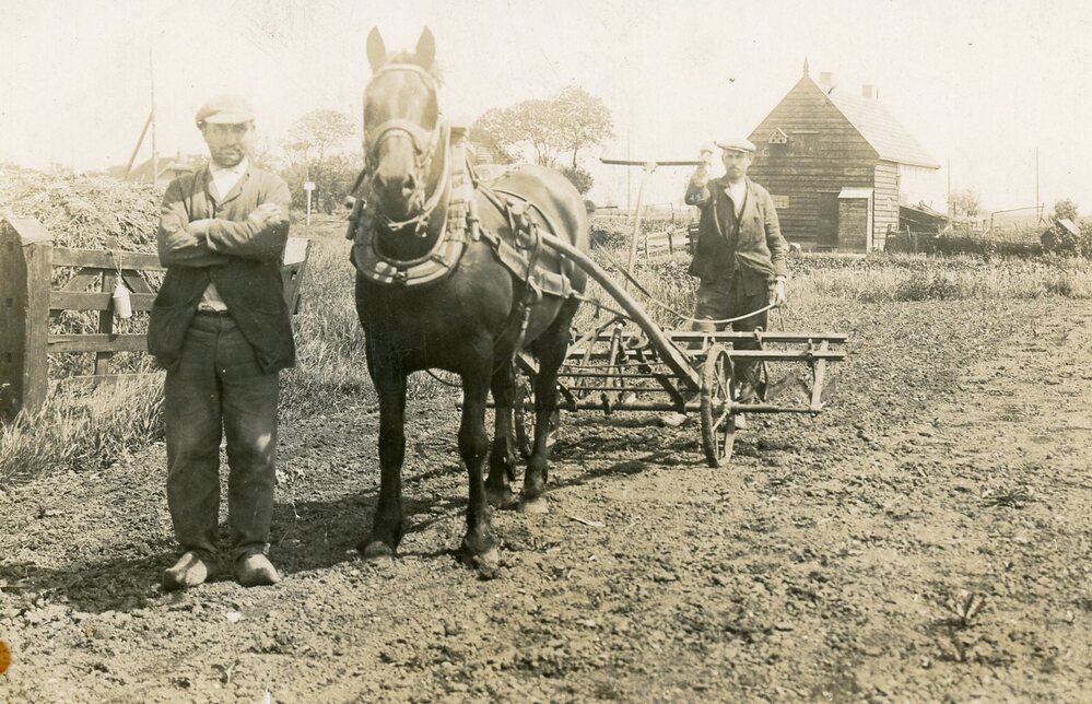 Twee mannen met paard aan het eggen