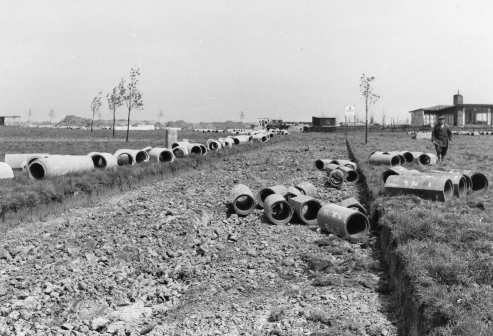 Foto, zwart/wit, Aanleg Zalmlaan. Achtergrond bungalow fam, Coors, de "Witte Waal".