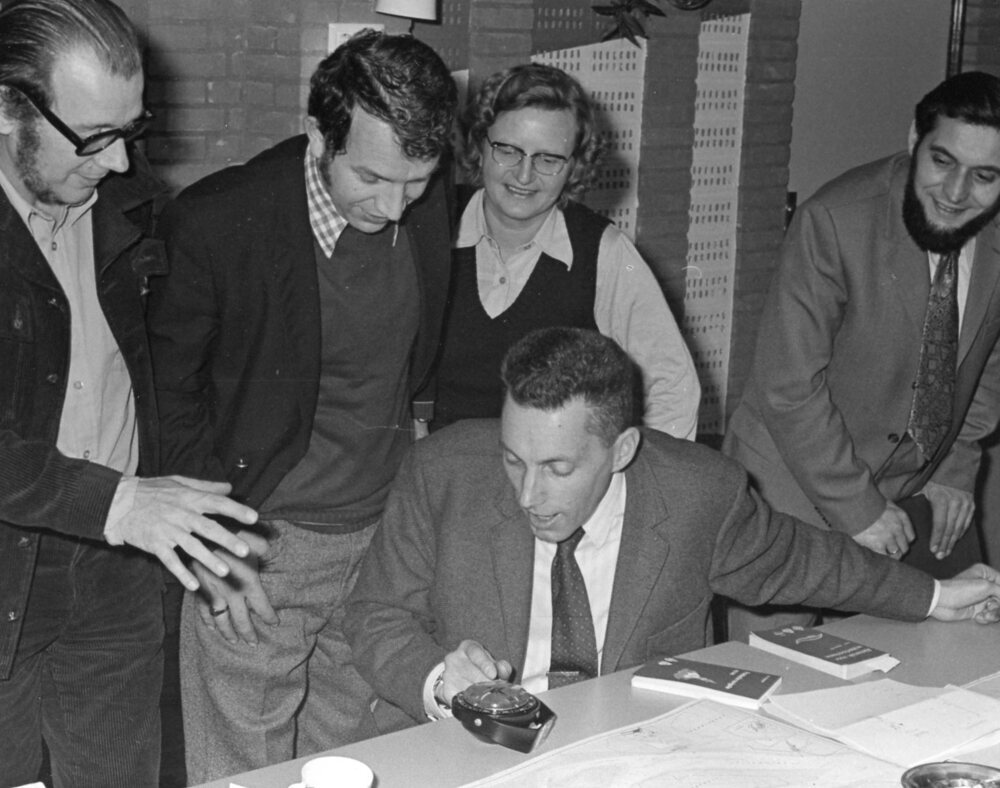 Foto, zwart/wit, Opening Dorpshuis "De Gaffelaar". Watersportver. Zwartewaal. Navigatiecursus,