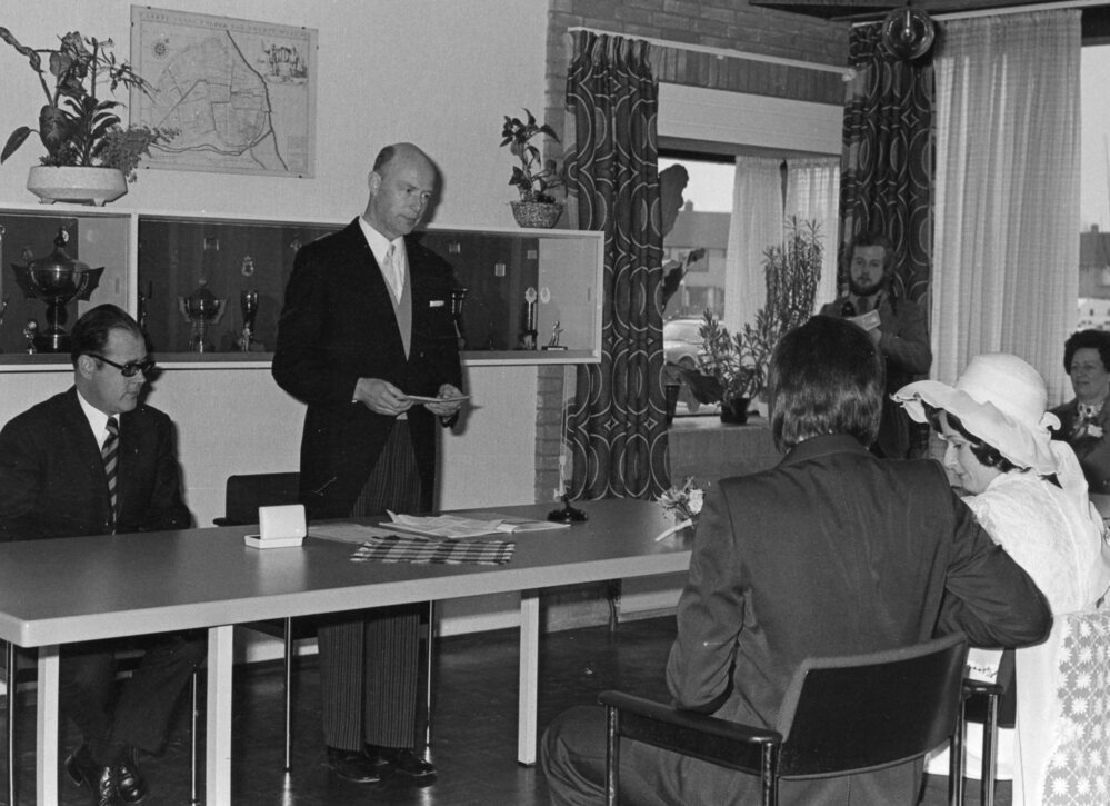 Foto, zwart/wit, Opening Dorpshuis "De Gaffelaar". Huwelijksvoltrekking van Arie Meyboon en Nelly van de Polder. Gemeente secretaris A.v.d Vlugt, Burgemeester J.G. Bosch.