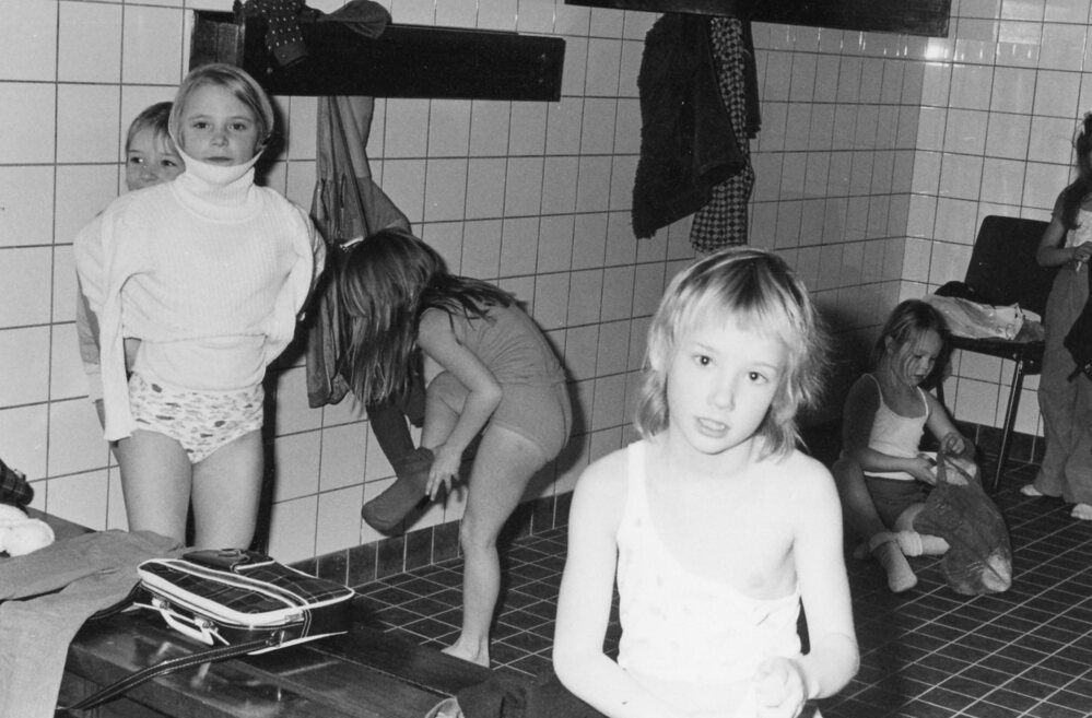 Foto, zwart/wit, Opening Dorpshuis "De Gaffelaar". Jeugdleden Gymnastiekvereniging "Hollemare" in de kleedkamer