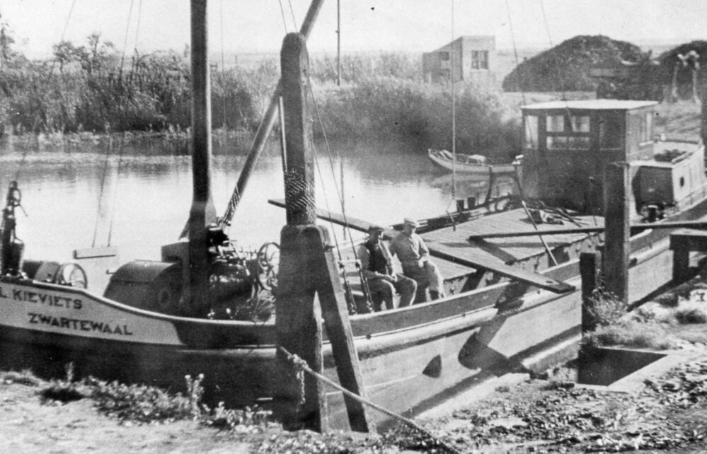 Foto, zwart/wit; beurtschip Helena van Leen Kievits aan de kade voor het kadeplein., met aan boord twee mannen. Op de achtergrond bergen aardappelen of bieten op de losplaats bij de weegburg. Aan boord Leen en Teun Kievits.