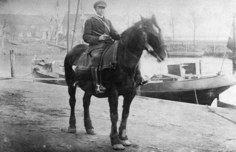 Foto, zwart/wit; L. Kievits te paard langs de havenbij het z.g. ringetje-rijden, tijdens een feest. In de haven ligt het oude beurtschip. Op de achtergrond de scheepswerf van fam. v.d. Zee