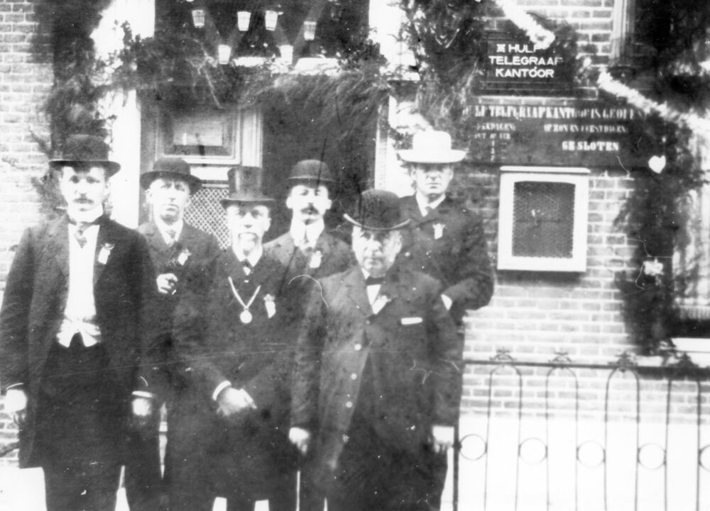 Foto, zwart/wit;Groep van zes mannen met hoed voor versierd telegraafkantoor Zwartewaal