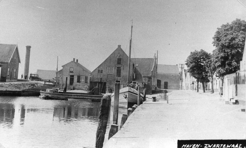 Foto, zwart/wit, Kade met zeilmakerij. Tankboot Am. Olie M5. Beurtschip "Lena" van Kievits. Schoorsteen gemaal met T Ford smid neecken.