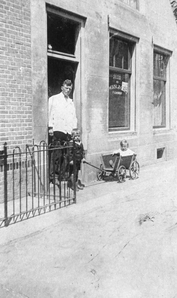 Foto, zwart/wit, Dorpsstraat. Rund en Spekslagerij P. Schoordijk, kind zoon Piet en in de wagen zoon Wim