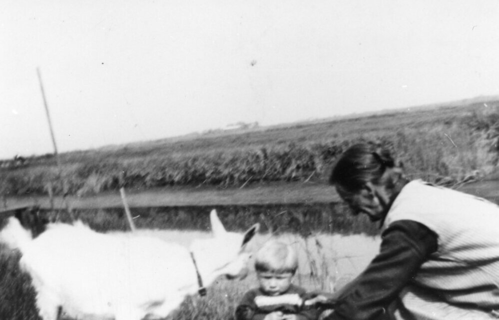 Foto zwart/wit: mevr Bouman - Schoordijk, de vrouw van een beroepsvisser met kleinzoon Arie schoordijk. De geit graast op groentje naast het huis, waarnu het oorlogsmonumentstaat. dit monument is mede gebouwd door hetzelfde jongetje als metselaar bij Jaap Vij.