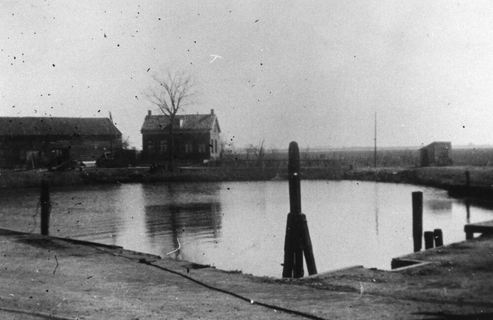 Foto zwart/wit: Havenkom met aanlegpaal en sluisje. Op de achtergrond de loods van de timmerwef van de fam. v.d. Zee metwoonhuis 't Wurfje. Rechts het huisje van de weegbrug.