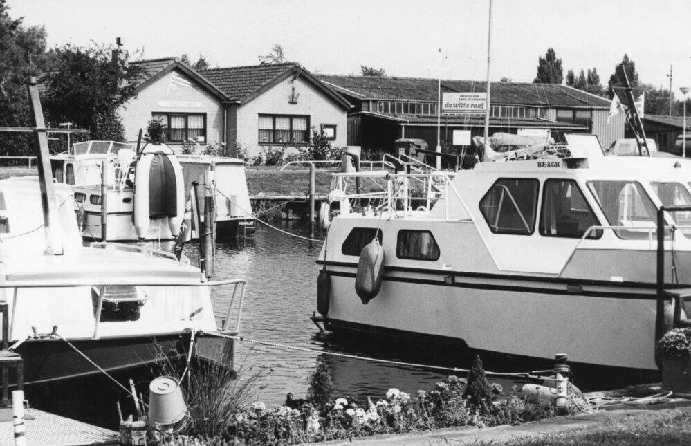 Foto zwart/wit: Foto vanaf de oostzijde van de haven bij "de Witte Raaf". Het gebouwtje is het clubgebouw "de Buiscap" van de WSV Zwartewaal. De loods hoort bij de jachthaven "de Witte Raaf".