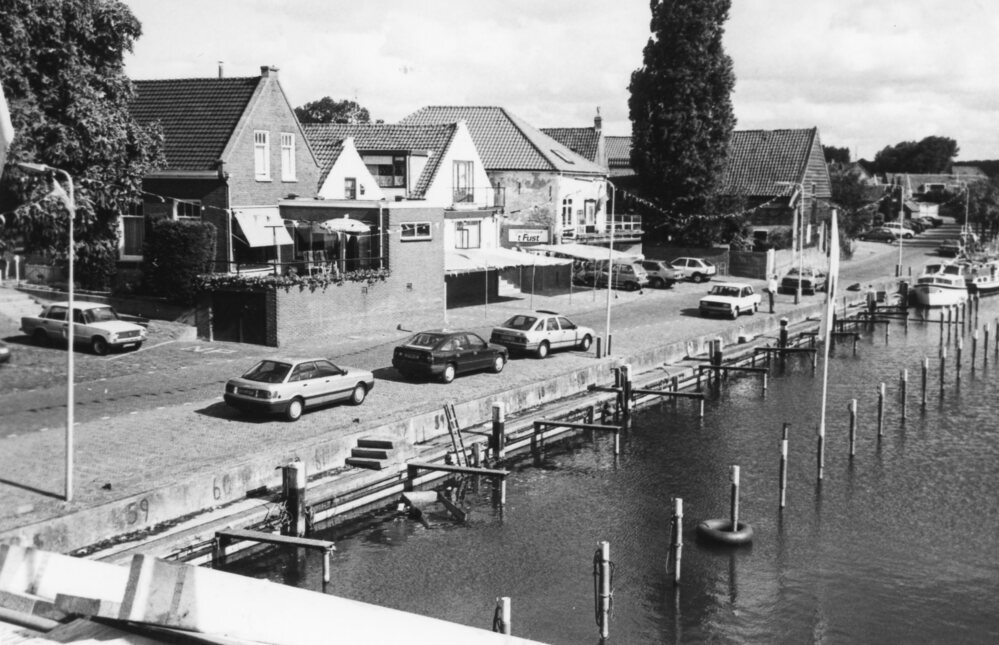 Foto zwart/wit: Jachthaven W.S.V. Zwartewaal zonder plezierjachten voor de Zwartewaalse Havendagen 1994. Op de kade Fam v.d. Hoek, Cafe 't Fust, Fam v. Duin en schuur fam Kuijpers.