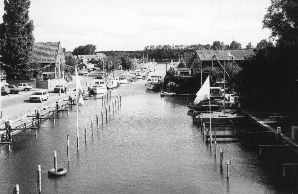 Foto zwart/wit: Jachthaven van Zwartewaal is leeggemaakt voor het tobbedansen tijdens de Zwartewaalse Havendagen 1994.Rewchts de scheepswerf van fam v d Zee