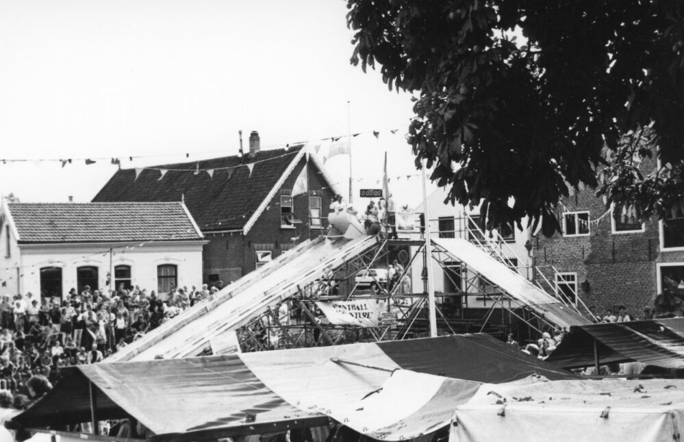 Foto zwart/wit: Braderie en Tobbedansen tijdens de Zwartewaalse Havendagen 1994. Op de achtergrond de boerderij van fam Monteny en onder de boom de zeilmakerij.