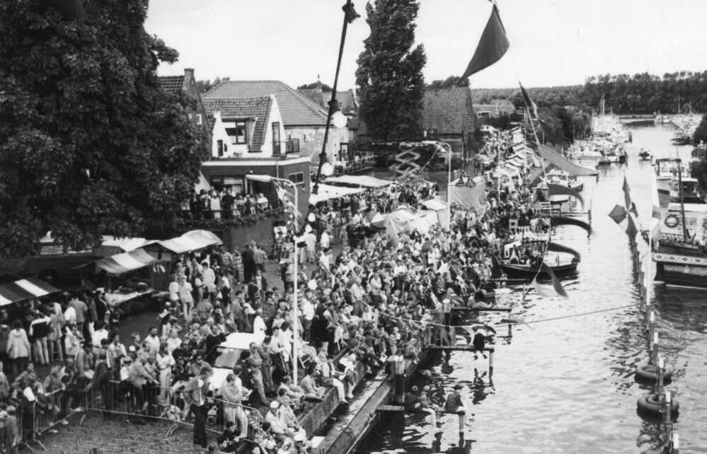 Foto zwart/wit: Zwartewaalse Havendagen 1994. Toeschouwers op de kade tijdens het tobbedansen