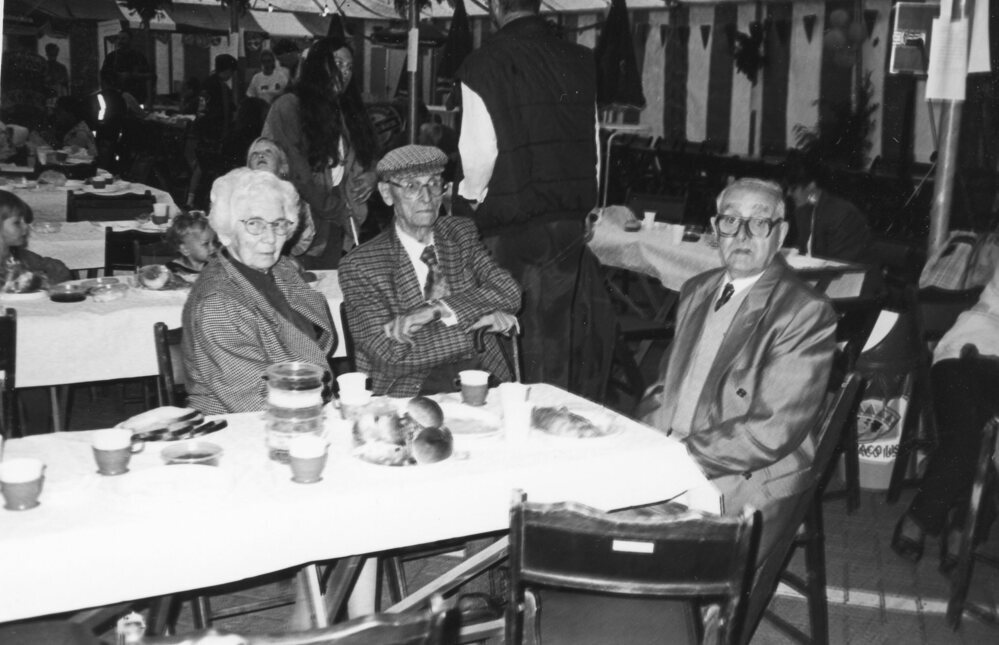 Foto zwart/wit: Zwartewaalse Havendagen 1994. Feesttent op de parkeerplaats, de "Karreman". v.l.n.r. mevr van Hulst- Schelling, dhr. J. hoftijzer en P. v.d. Hoek. ( Postbode )