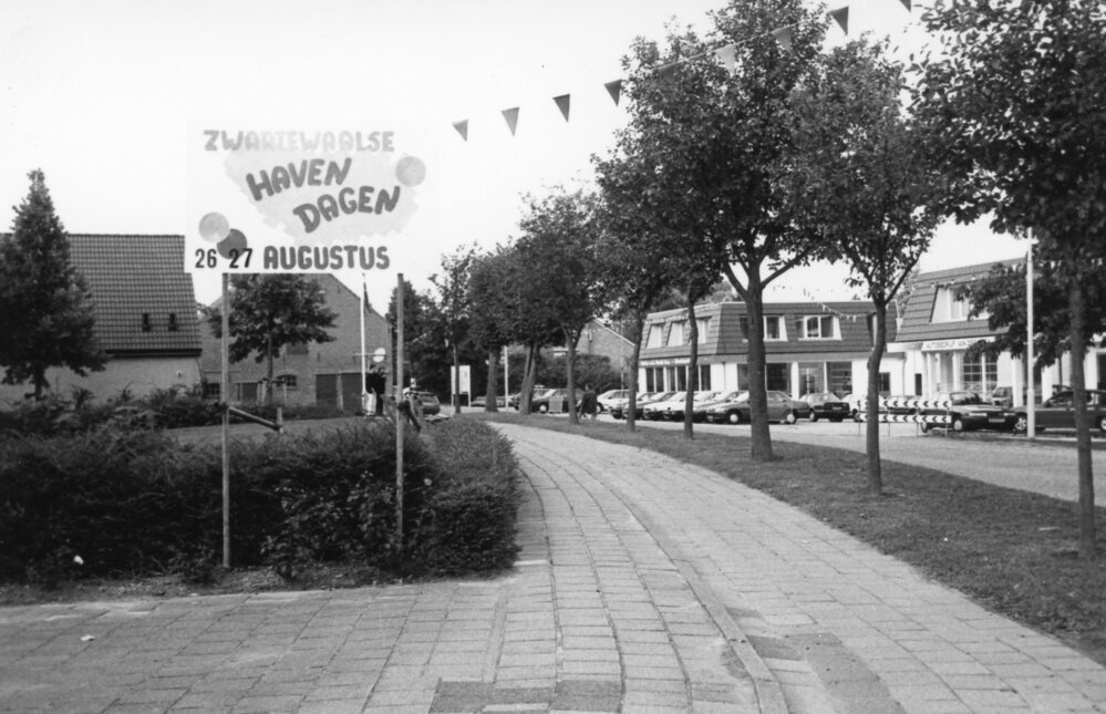 Zwart/wit foto: Zwartewaalse Havendagen 1994. Henri Fordstraat met aankondigingsbord van de Zwartewaalse havendagen op 26 augustus. Rechts de garage van de fam v.d. Hoek.