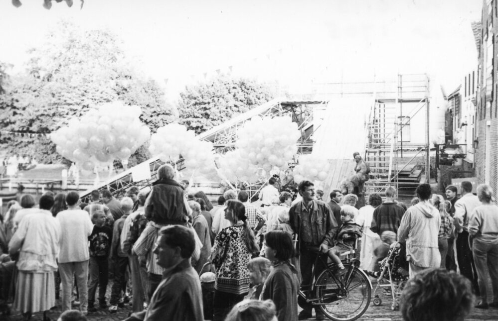 Foto zwart/wit: Zwartewaalse Havendagen 1994. Kadeplein met stellage voor tobbedansen.Foto genomen tijdens de opening met ballonwedstrijd.