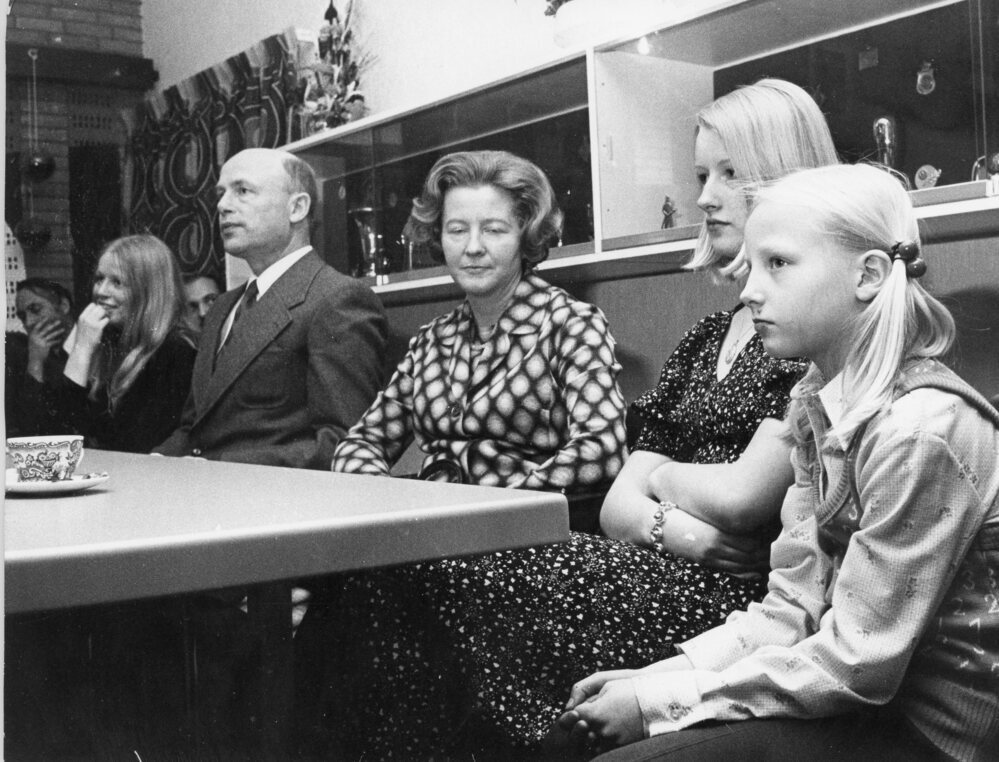 Foto. zwart/wit Afscheid van burgemeester J.G. Bosch op 16 maart 1974, v.l.n.r. dochter, burg Bosch, mevr Bosch, dochter, dochter