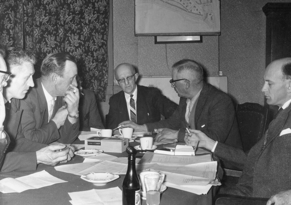 Foto, zwart/wit, Gemeenteraad, v.l.n.r. A. v.d. Hoek, onbekend, Jaap v.d. Wel, Rinus Brobbel, onbekend, Burgemeester Bosch.