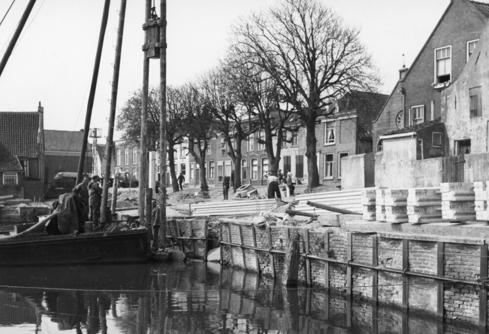 Foto zwart/wit. Reparaties van de oude kademuur. Op de foto is de oude beschoeiing tezien