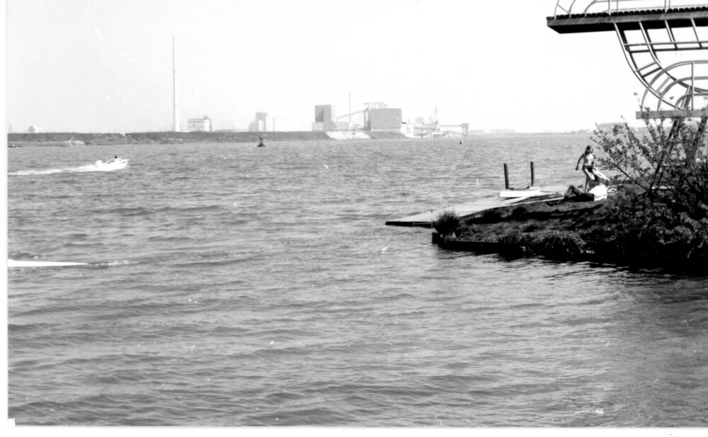 Foto, zwart/wit, Duiktoren bij de jachthaven " de Witte Raaf" . Op de achtergrond zijn de bedrijven in de Botlek.