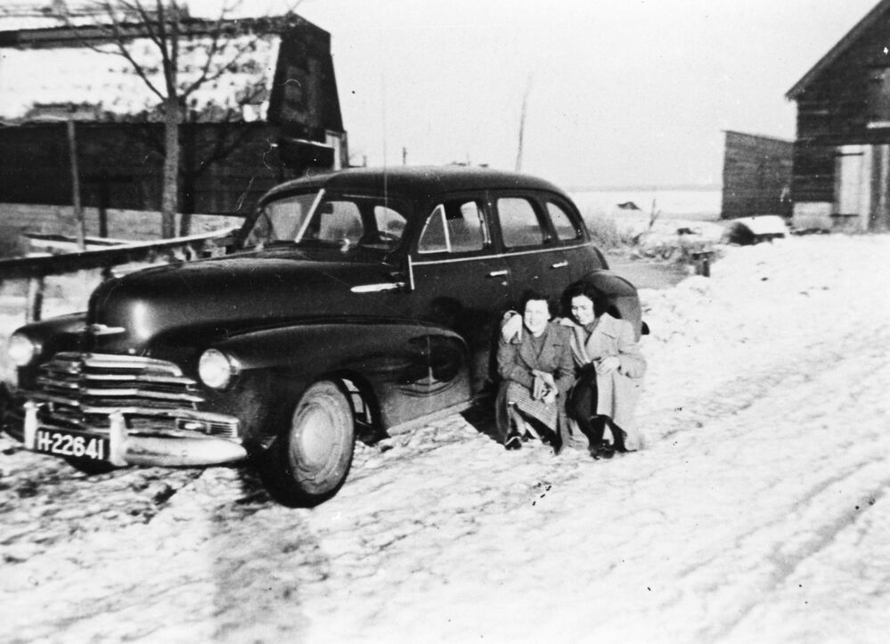 Foto zwart/wit: Twee dames voor een auto op de Elfwekenlaan in de sneeuw. Op de achtergrond rechts de Steekschuur.