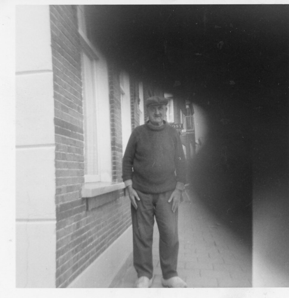 Foto zwart/wit: Dhr Leen Hoftijzer op het Zuideinde. Op de achtergrond het postkantoor.