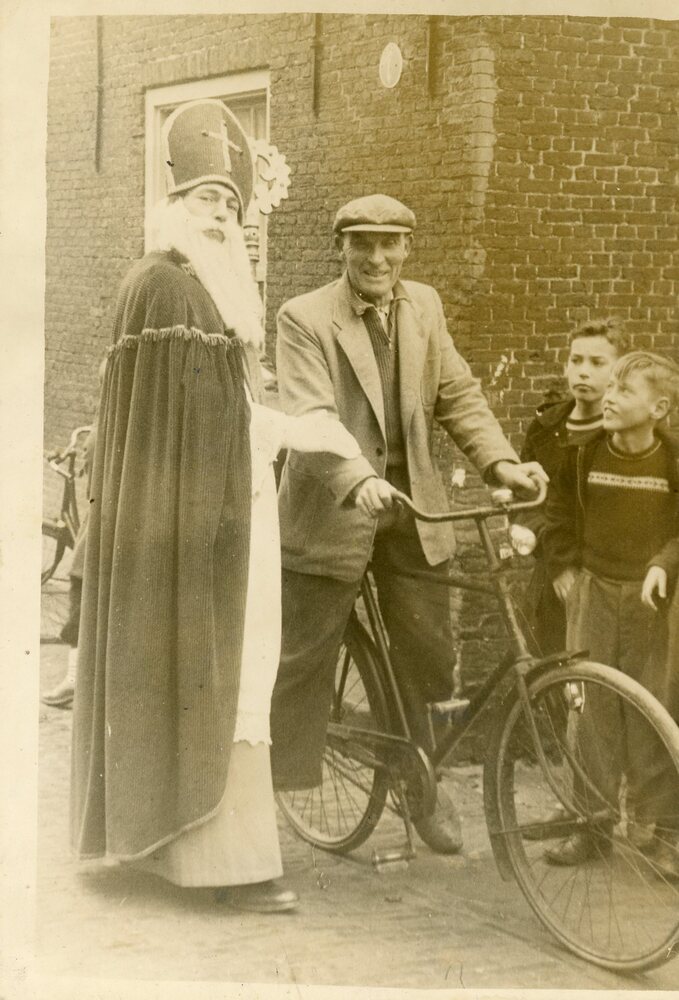 Sint Nicolaas met fietser en twee jongentjes