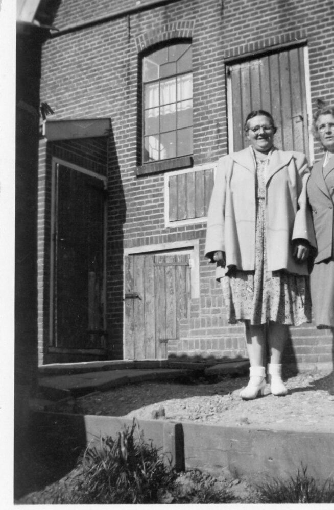 Foto zwart/wit: Achterzijde Noordeinde. Evangelisatiegebouw. eerste bewoning van dit gebouw was in de oorlog. Op de foto, Mw D. Hoftijzer-Aalbregtse, Mw Osephuis.