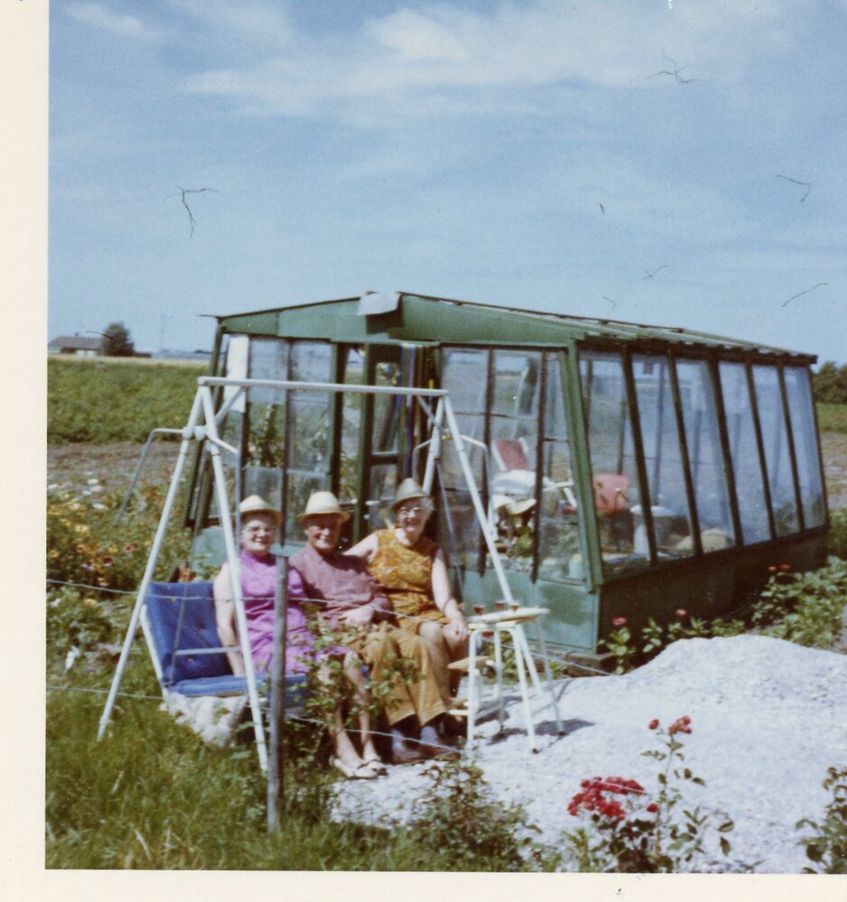 Foto, kleurenfoto, Hobbykasje aan de Schoolstraat. v.l.n.r. Mina Aalbregtse, Fam Kastelein-Kok. Kasje c/q Burgemeesterkas, illegaal gebouwd.