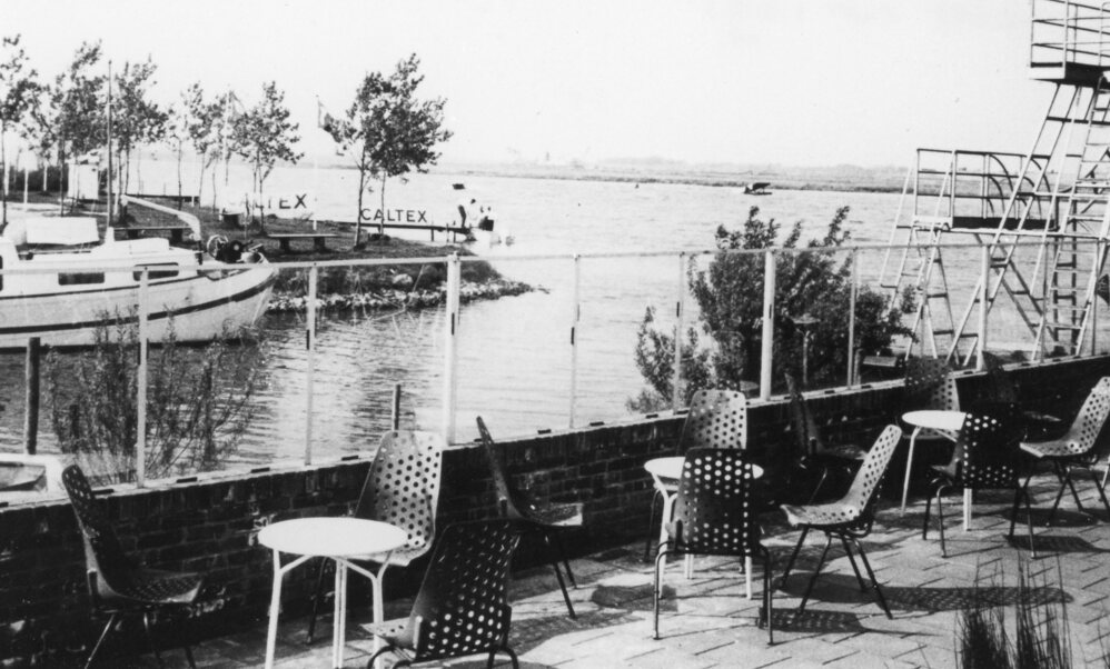 Foto zwart/wit. Terras jachthaven "de Witte Raaf". Gezicht op de Brielse Maas met de duiktorens. Aan de andere kant een plezierjacht en de aanlegsteiger met Caltex reclame. Op de Brielse Maas in de verte de springschans van de waterski vereniging Nautica.