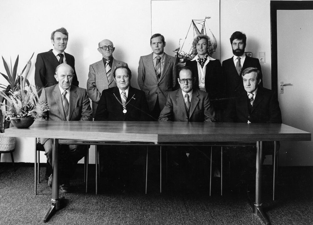 Laatste gemeenteraad van Zwartewaal. Staand vlnr W. Zeeman, M. Brobbel, W. Veldheer, E van Loon, , F van de Lee; zittend: J v d Wel, burgemeester van Rhijn, C. Losslanje, A v d Vlugt, P Hoek