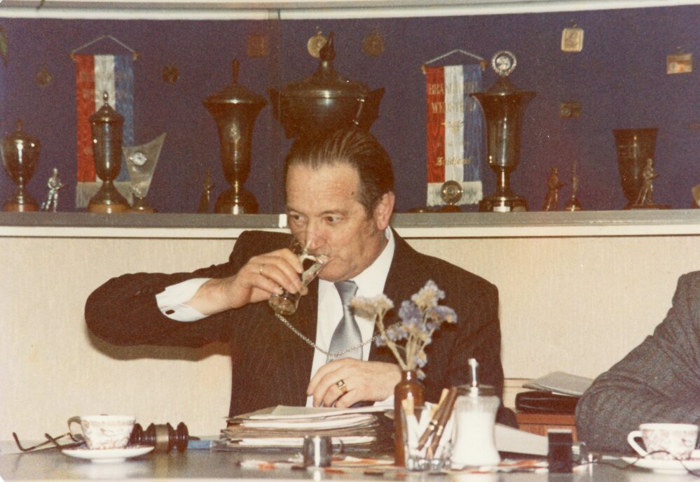 Raadsvergadering in dorpshuis, Burgemeester Korstanje.