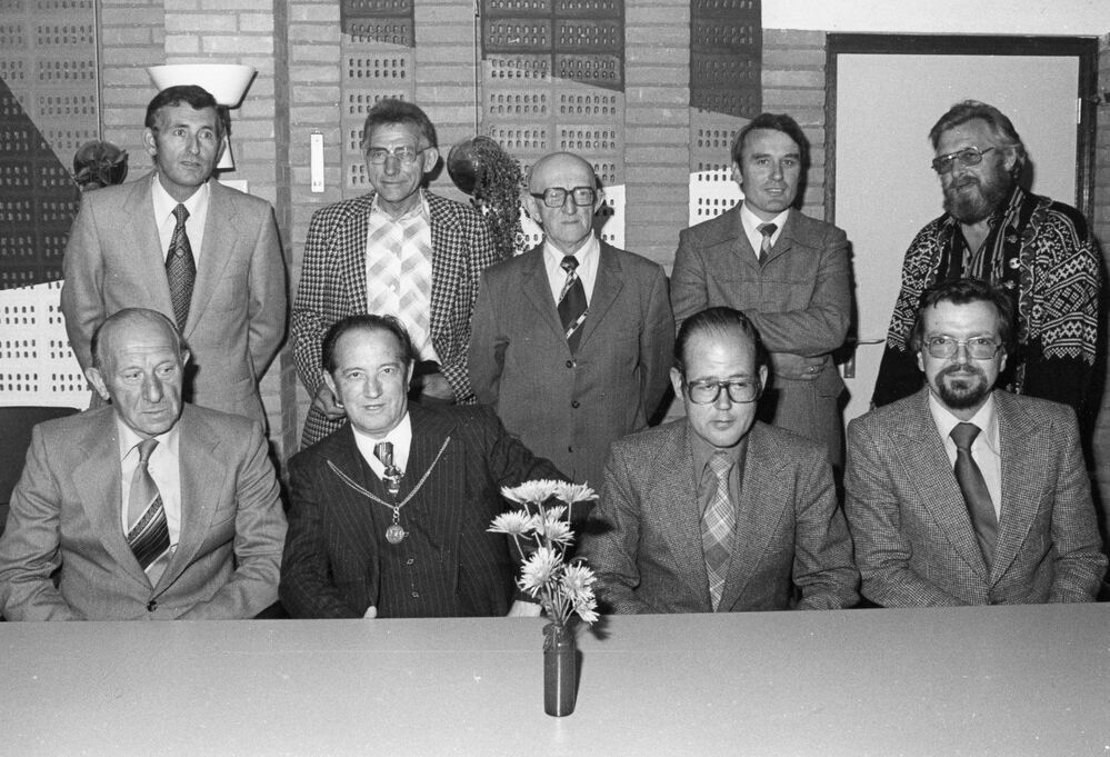 Foto, zwart/wit, de leden van Gemeenteraad 1975. vlnr staand: W v Heijzen, Jacob Stolk, M Brobbel, W Zeman, Kuut; zittend: J vd Wel, C Korstanje, A vd Vlugt, A van Spronsen