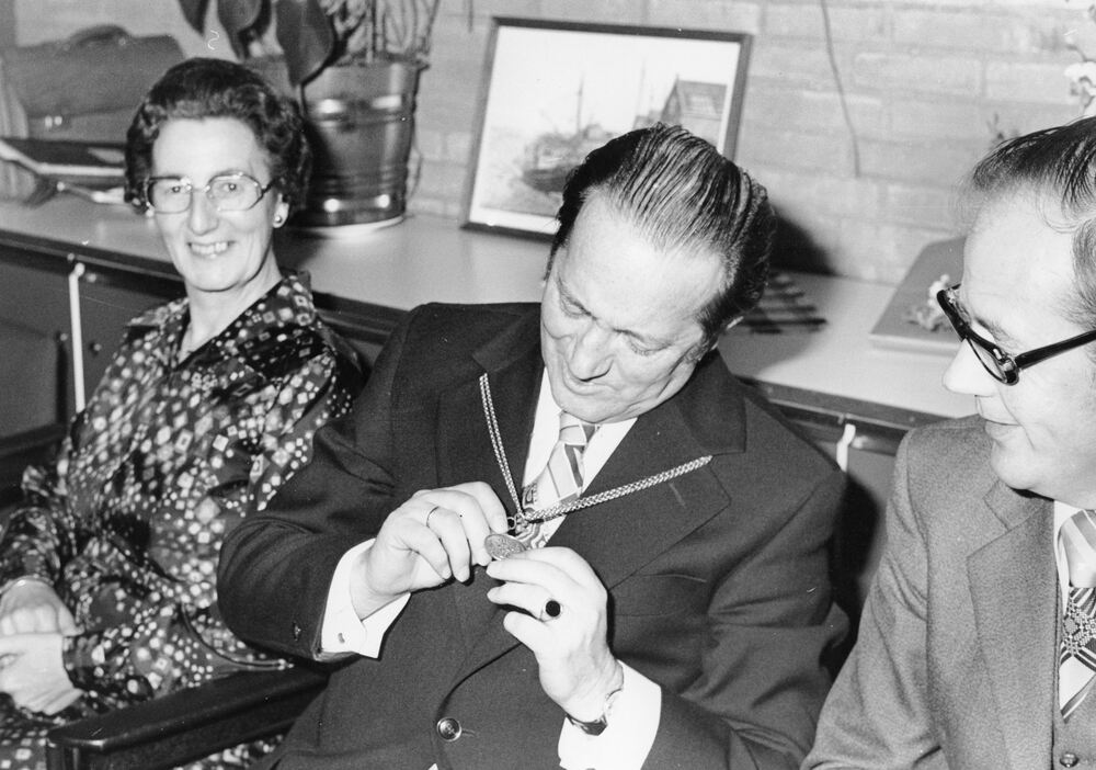 Gemeentehuis Zwartewaal, burgemeester Korstanje met 2 personen