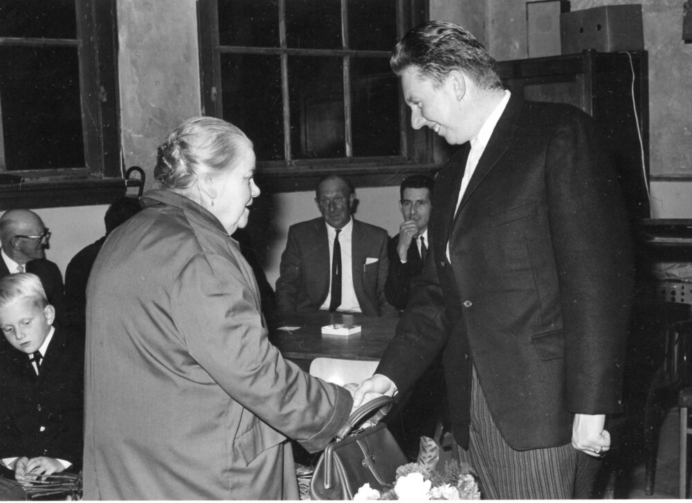 Foto, zwart/wit, Man in trouwpak wordt gefeliciteerd door dame in regenjas. afgebeeld vlnr: M Brobbel, Bert de Groot, Sluime, J vd Wel, W v Heijzen, K de Groot