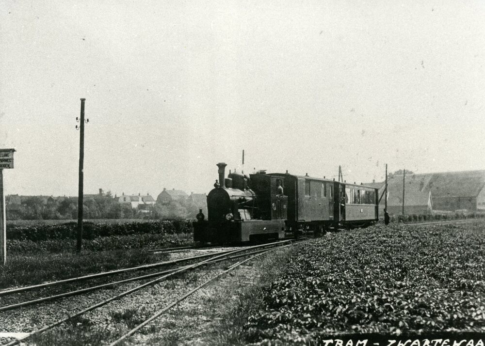 Foto, zwart/wit, Tramstation Molendijk 10 Zwartewaal. De stoomtrein komt het station binnenrijden vanuit Spijkenisse. Op de achtergrong de achterzijde van het Zuideinde nu Henry Fordstraat.