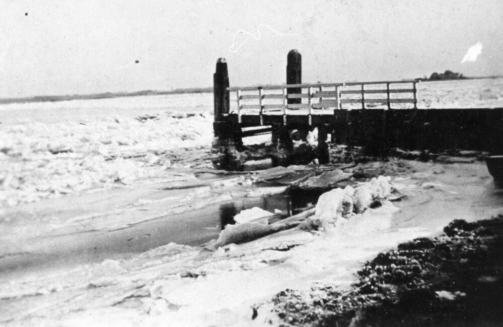 Foto, zwart/wit; Brielse Maas Havenhoofd winter, voorgrond kruiend ijs.