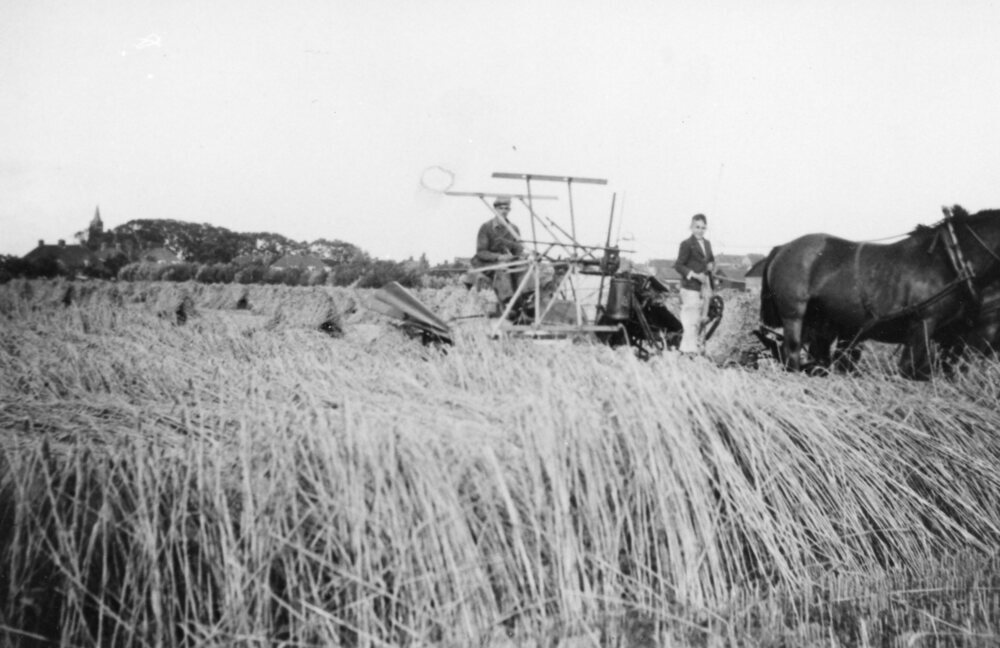 Foto zwart-wit. Vader en zoon Lageweg met maaimachine, getrokken door paarden