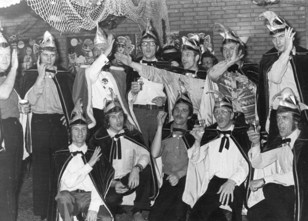 Foto zwart/wit. Carnaval vereninging "De hobbelende Bierviltjes".