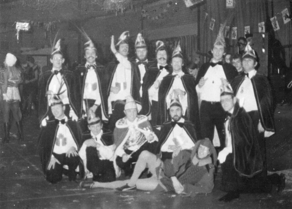 Foto zwart/wit. Carnaval vereninging "De hobbelende Bierviltjes".