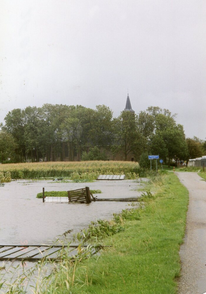 Foto kleuren. Wateroverlast. Volkstuintjes Looierij onderwater. Gezicht op de Martinuskerk.