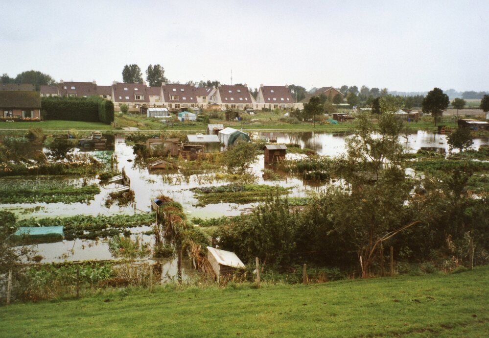 Foto kleuren. Wateroverlast. Volkstuintjes onderwater. Gezicht op de Prins Alexanderstraat vanaf Maasdijk.