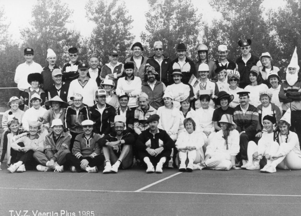 Foto zwart/wit. Tennis Vereniging Zwartewaal. Veertig Plus 1985