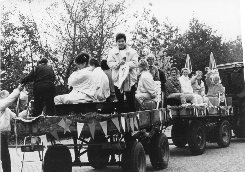 Foto zwart/wit.Leden Tennis Vereniging Zwartewaal, de groep Veertig Plus 1985 op platte wagens.