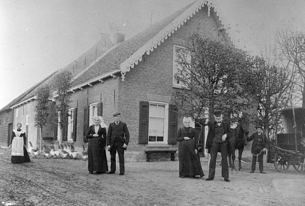 Boerderij Mosterddijk 7. V.l.n.r. Dienstbode(onbekend), dochter Pietertje, Zoon Hendrik, Moeder Pietertje van den Ban( 1839), vader Dirk van der LInde (1832), bij het paard Pieter Poldervaart.