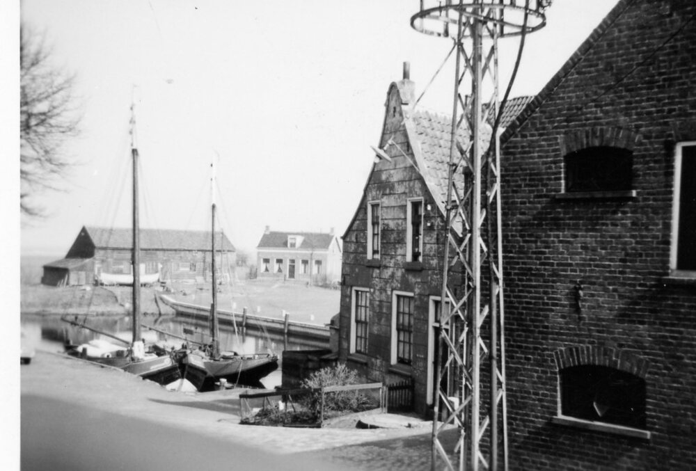 Foto zwart/wit: Havenkade /Werfplein. Aangemeerd zijn twee tjalken.