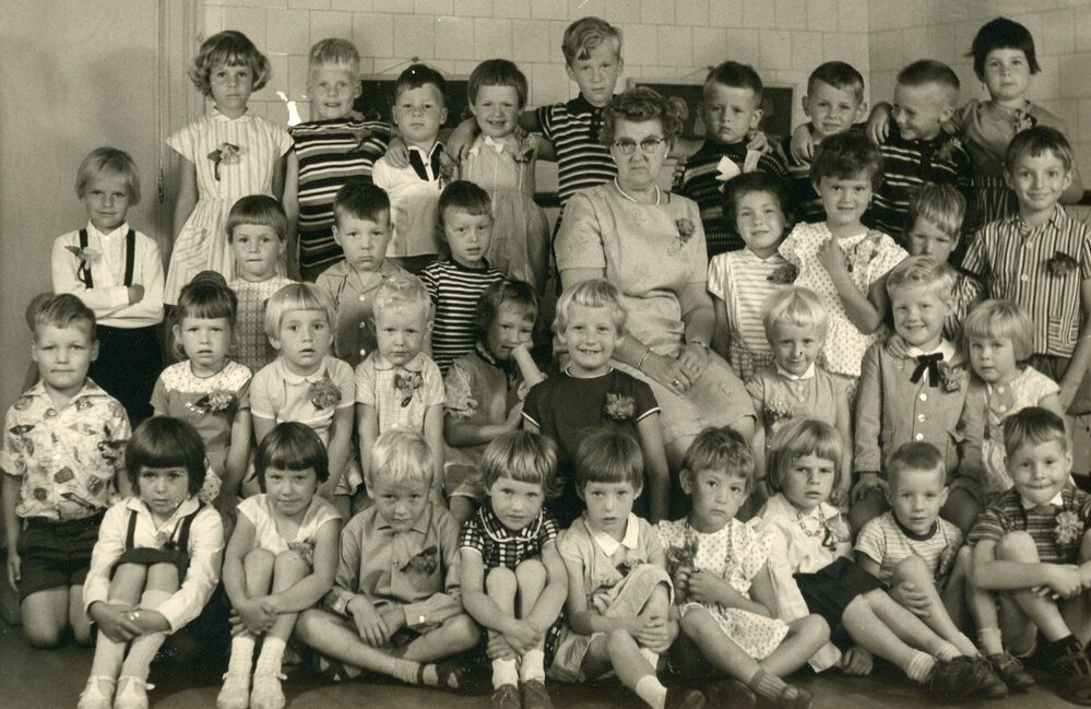 Foto zwart/wit: Kleuterschool klassefoto Hofkensstichting 1967. Zie documentatie voor de namen van de afgebeelde personene